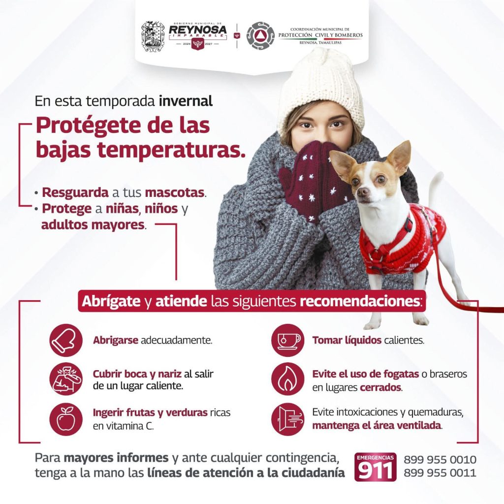 El Gobierno Municipal de Reynosa recomienda a la población tomar medidas de prevención ante las bajas temperaturas que cubren la región, de acuerdo al Servicio Meteorológico Nacional y organismos que estudian el clima, esta noche de domingo 25 de enero podrá terminar entre los 2° y 3° Centígrados.