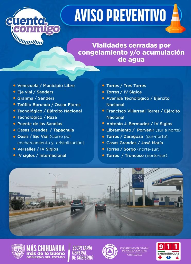 CHIHUAHUA.- Ante las bajas temperaturas que se han registrado en gran parte del estado, principalmente sobre la región fronteriza, la Coordinación Estatal de Protección Civil Chihuahua exhorta a la ciudadanía a evitar accidentes, derivado a la congelación de calles y avenidas de Ciudad Juárez.