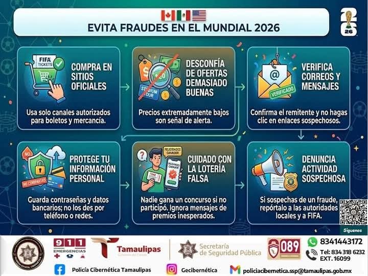 La Secretaría de Seguridad Pública de Tamaulipas (SSPT) a través de la Guardia Estatal Cibernética te brinda recomendaciones para evitar el fraudes durante el mundial: