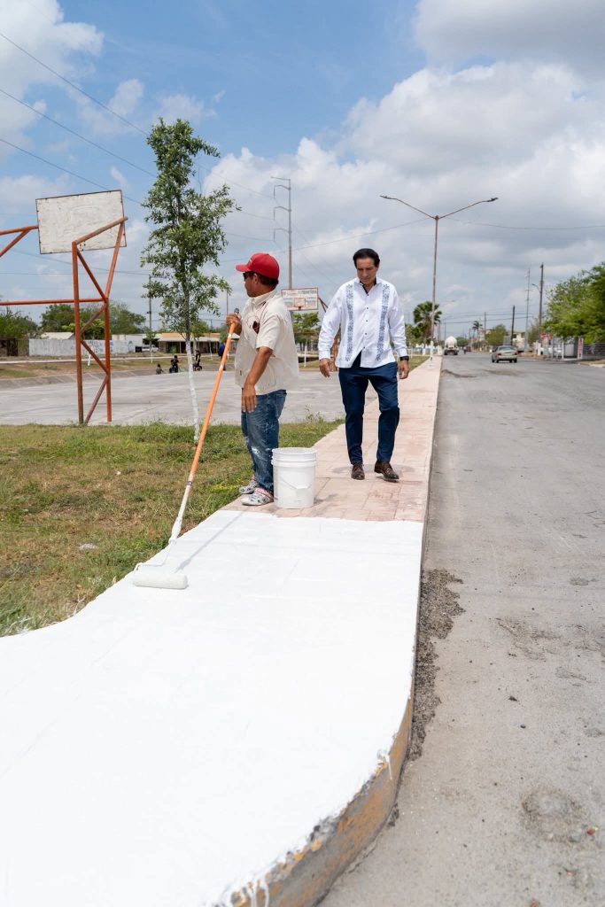 VALLE HERMOSO.- El Presidente Municipal estuvo presente en el Boulevard de la calle Séptima, donde supervisó una brigada de limpieza y pintura realizada en coordinación con la Iglesia Castillo del Rey.