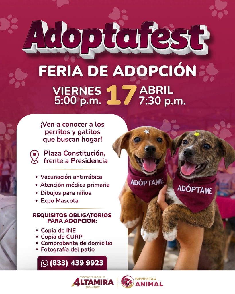 ALTAMIRA.- El gobierno municipal te invita al próximo Adoptafest para conocer a los perritos y gatitos que buscan encontrar una familia con quien compartir su vida.