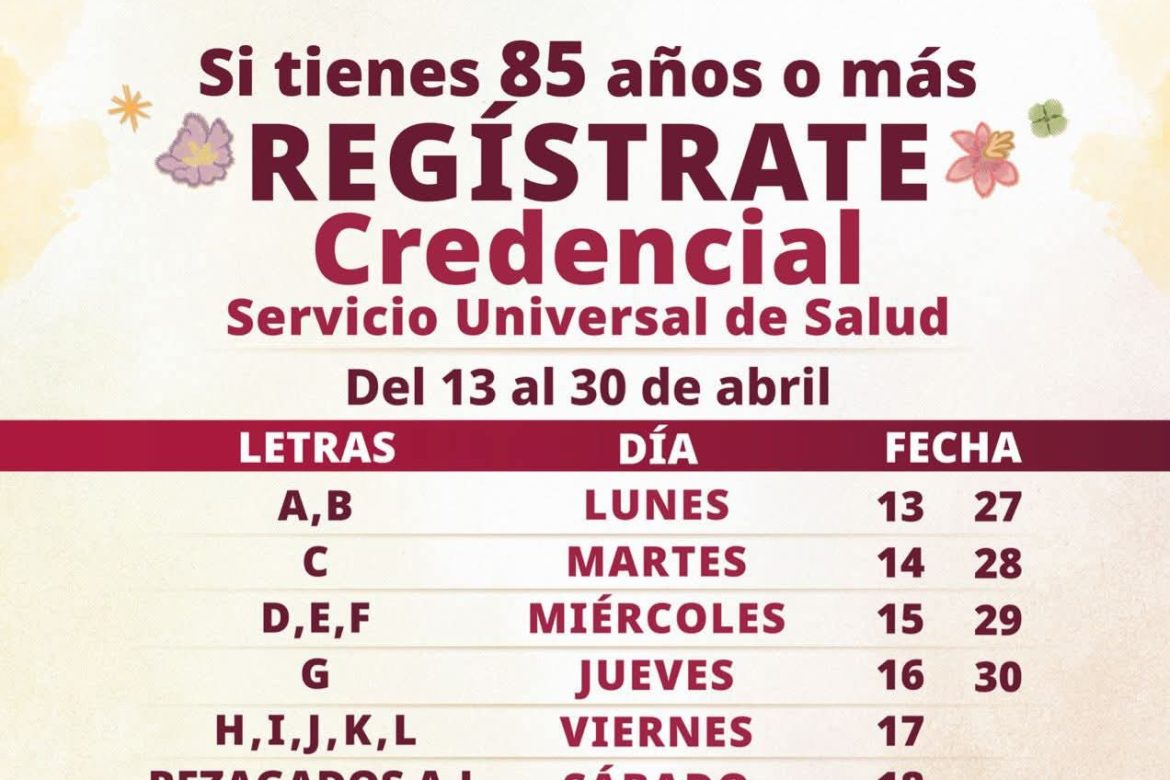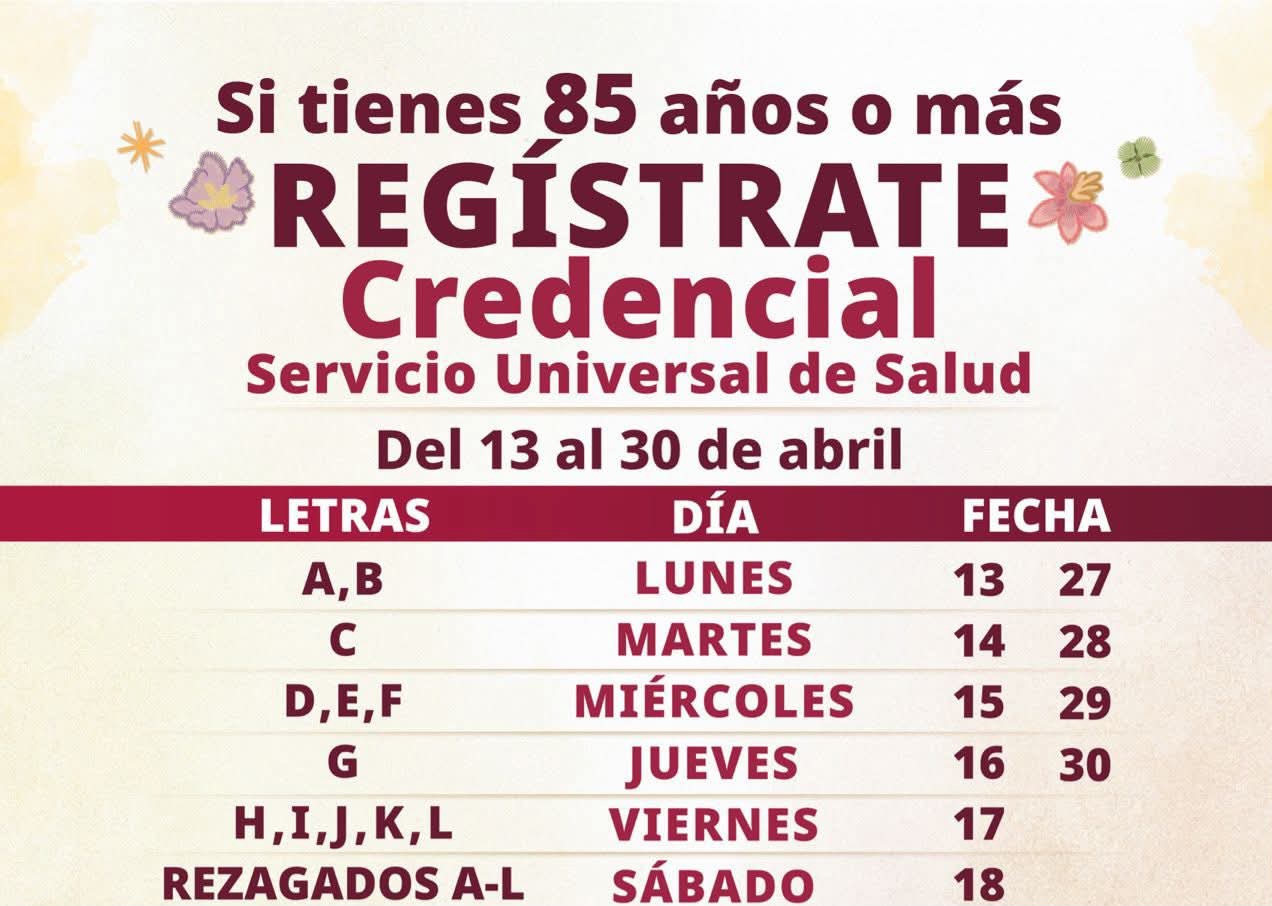 Del 13 al 30 de abril se registrará a las personas de 85 años o más, y se realizará conforme a la letra del primer apellido.