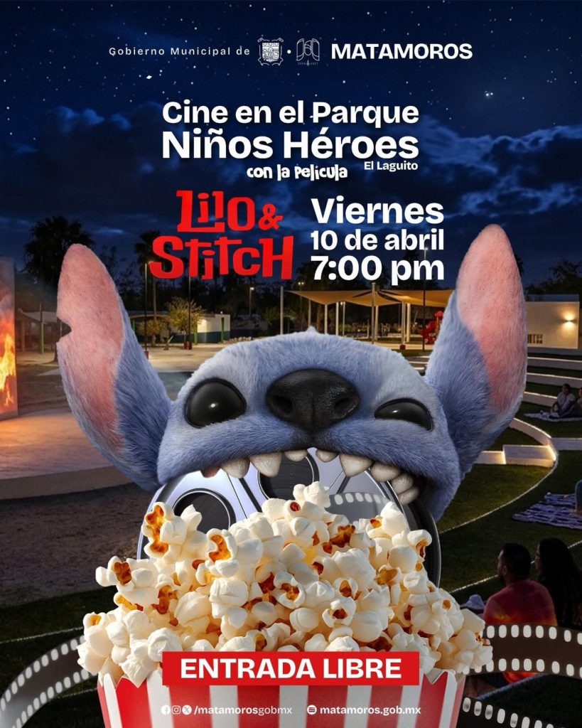 Matamoros NoticiasInvitan al cine en el parque Por Editor-2access_time2 semanas ago El Gobierno Municipal de Matamoros te invita este viernes 10 de abril a Cine en el Parque. Disfruta en familia de la película Lilo & Stitch en el Parque Niños Héroes. 7:00 p.m. Entrada libre
