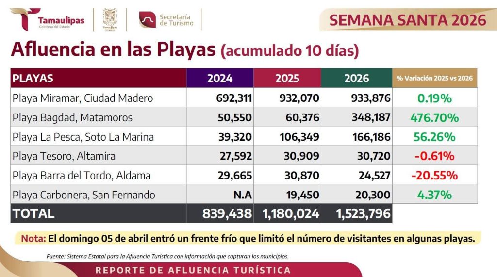El gobernador Américo Villarreal presentó hoy el balance preliminar del operativo de Semana Santa 2026, destacando el crecimiento en la afluencia turística y una derrama económica superior a los 2 mil millones de pesos en los primeros días del periodo vacacional.