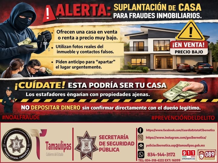 La Secretaría de Seguridad Pública de Tamaulipas (SSPT) a través de la Guardia Estatal Cibernética te da las siguientes recomendaciones sobre la suplantación de casas reales para cometer fraudes inmobiliarios.