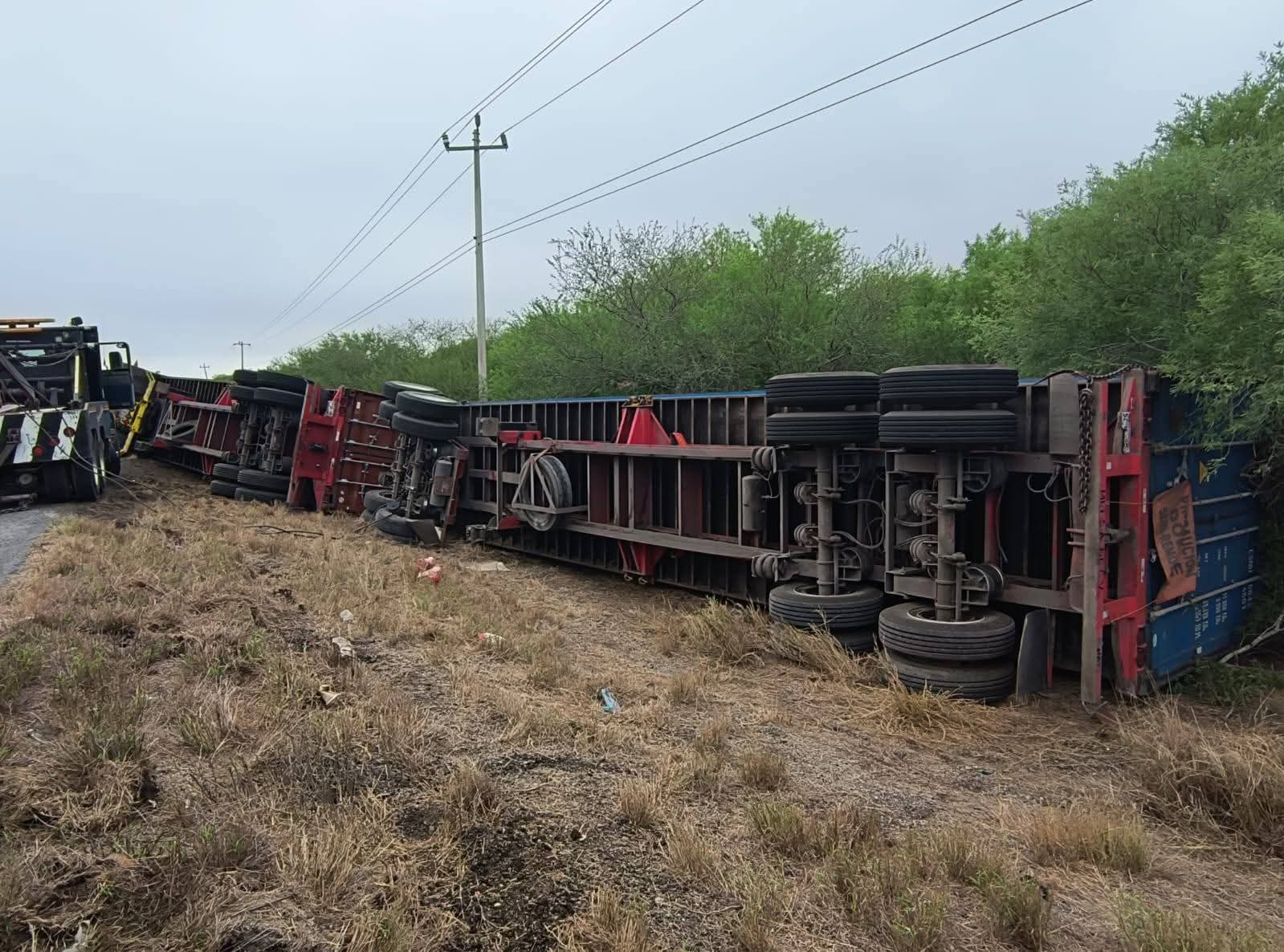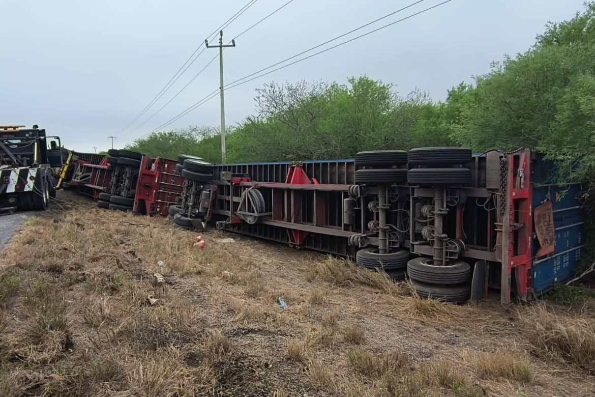 Jiménez, Tamaulipas.- Un tractocamión volcó la madrugada de este sábado sobre la Carretera Federal 101, en el tramo Victoria–Matamoros, a la altura del kilómetro 89, sin que se reportaran personas lesionadas.