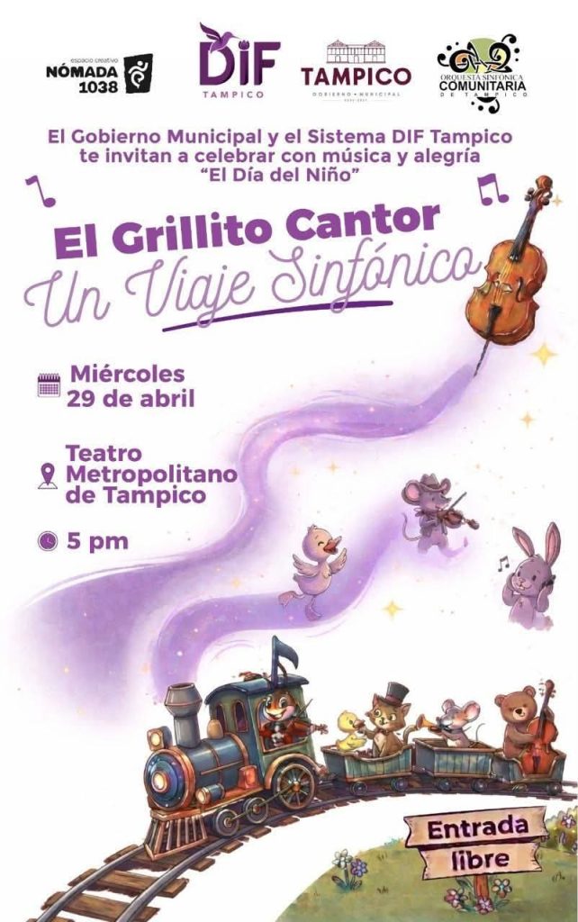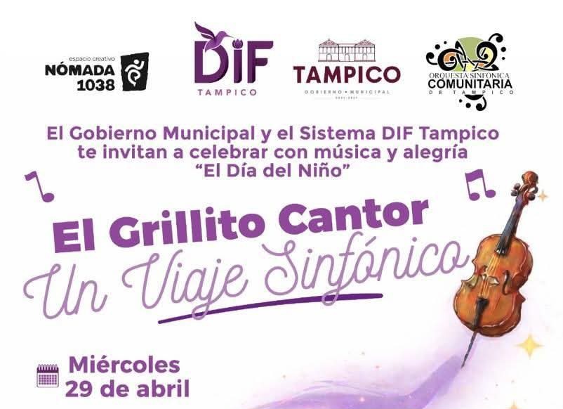 TAMPICO.- El Gobierno Municipal y el Sistema DIF Tampico te invitan a disfrutar de “El Grillito Cantor: Un Viaje Sinfónico”. Una tarde mágica para recordar las canciones clásicas de Cri-Cri junto a la Orquesta Sinfónica Comunitaria de Tampico.