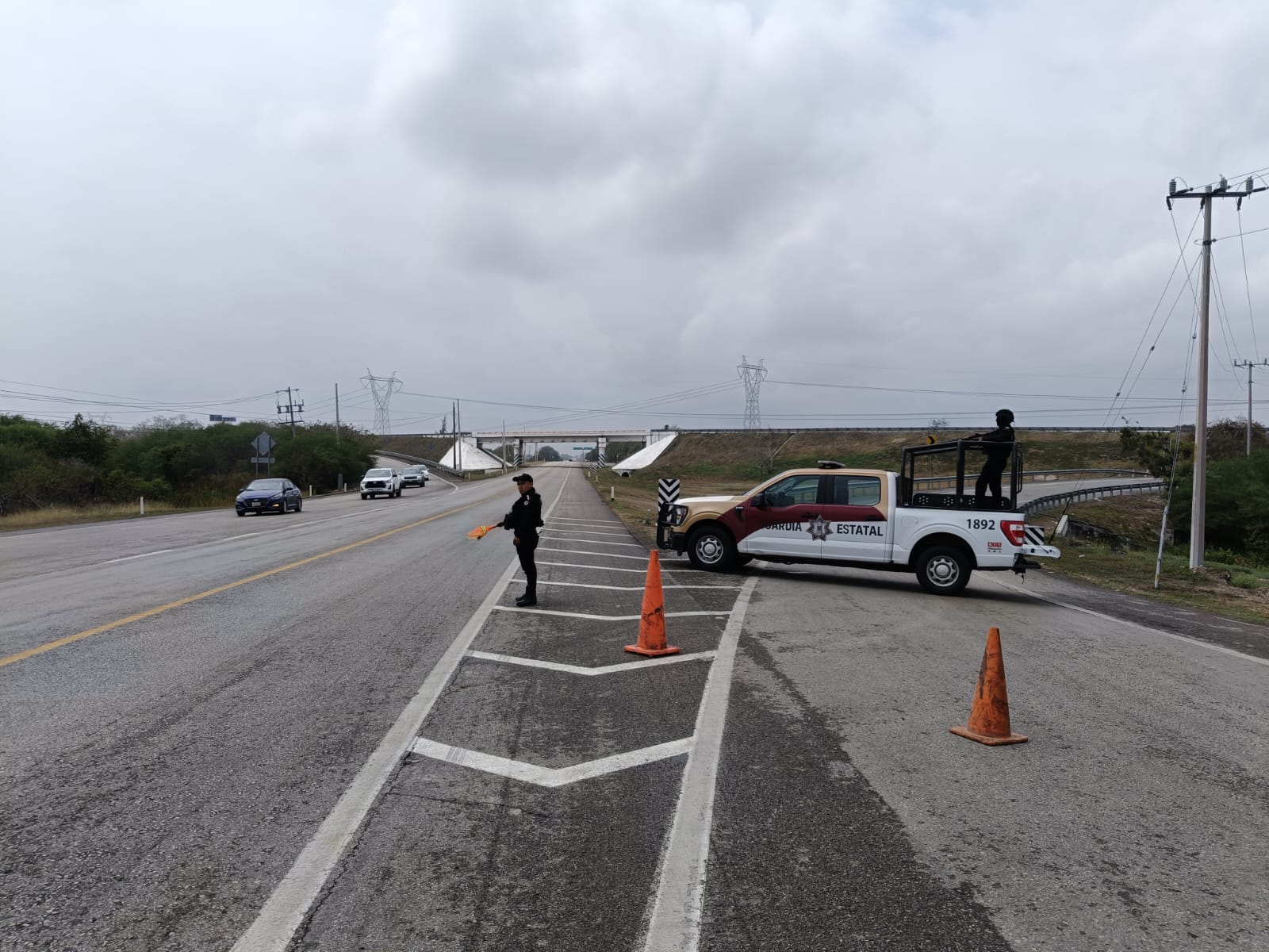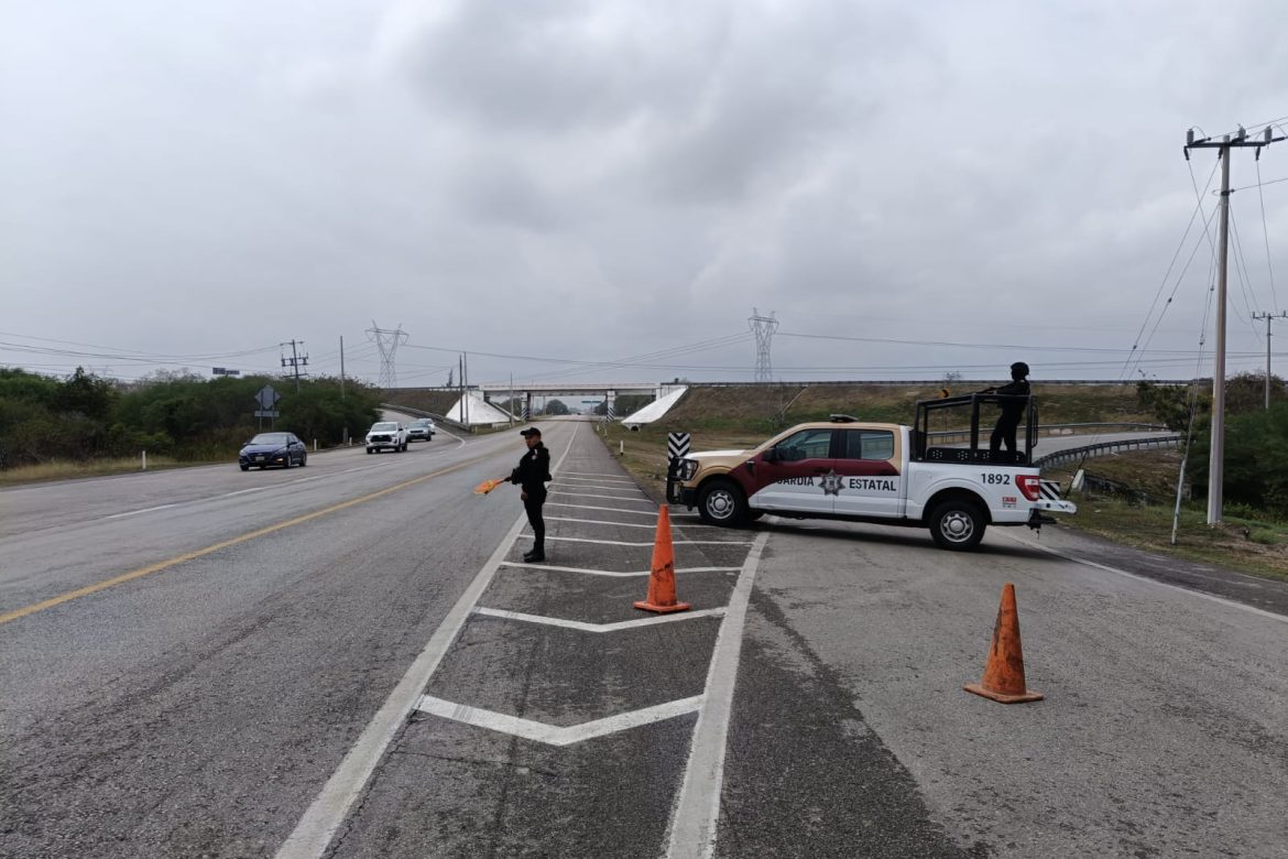 Personal de la Guardia Estatal de Apoyo Carretero perteneciente a la Estación Segura Villa Manuel se encuentra en el área brindando seguridad y apoyo vial.