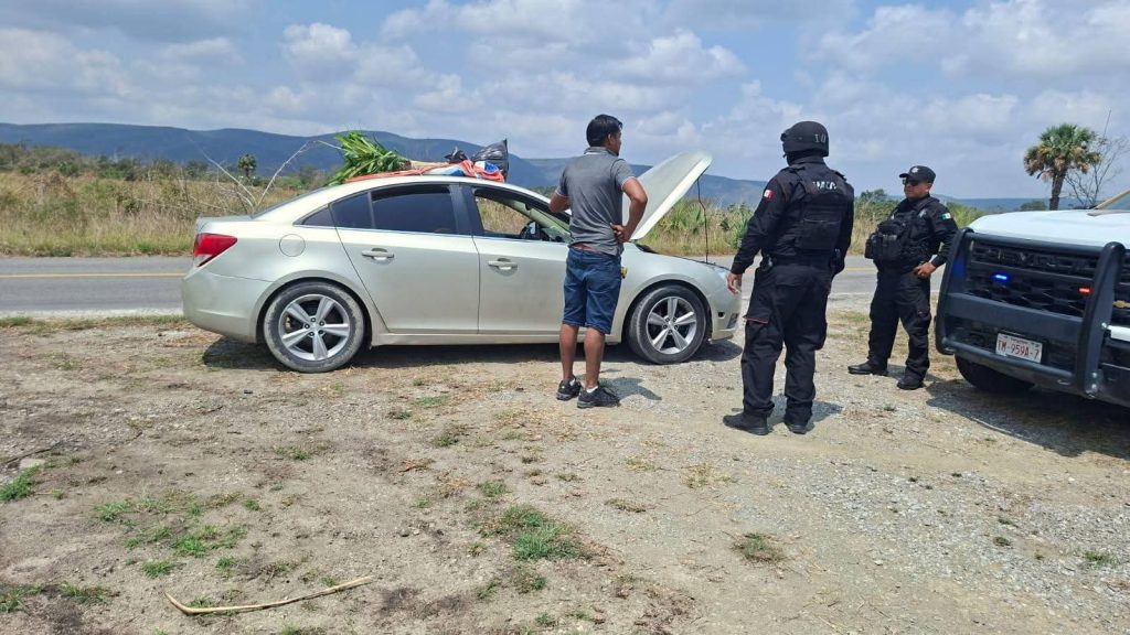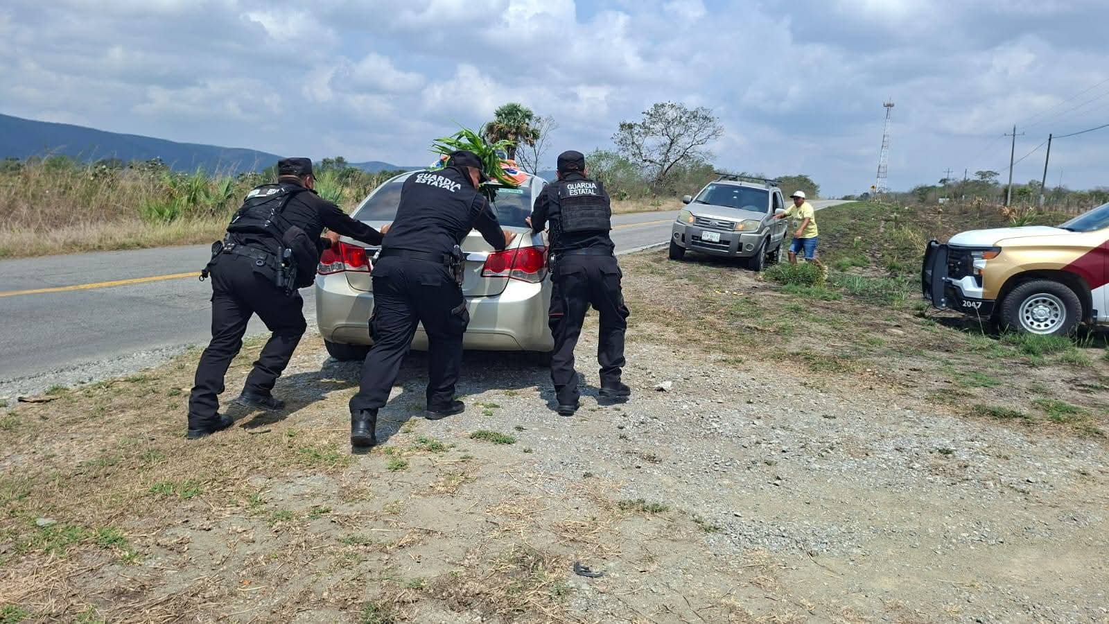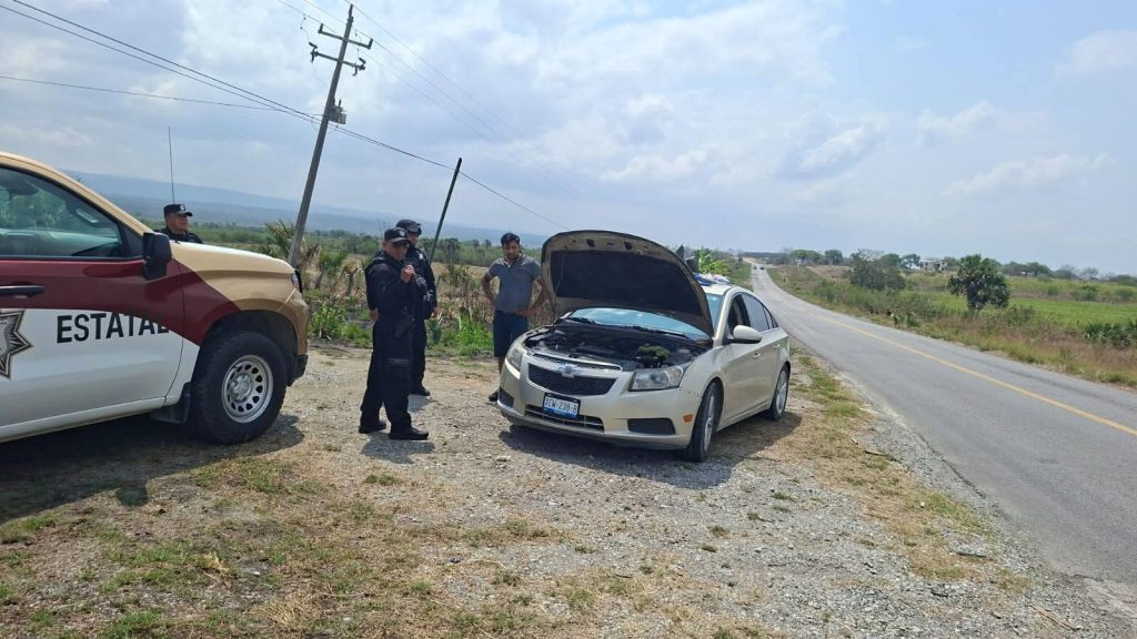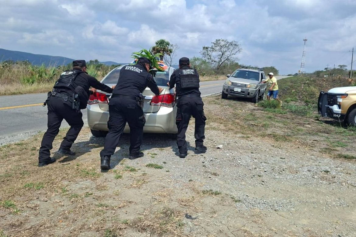 Con el objetivo de movilizar al vehículo, elementos de la Guardia Estatal contactaron a un mecánico de la localidad y le asistieron en las maniobras, asimismo, brindaron vialidad hasta los límites con la vecina entidad.