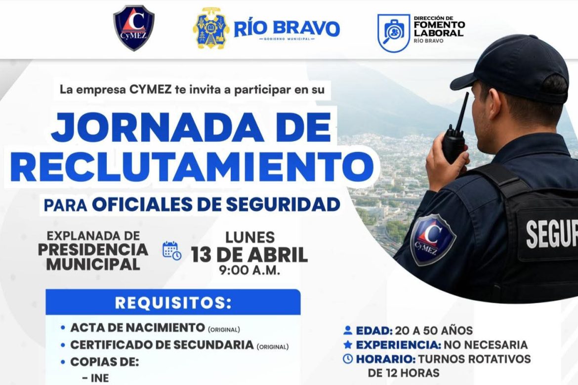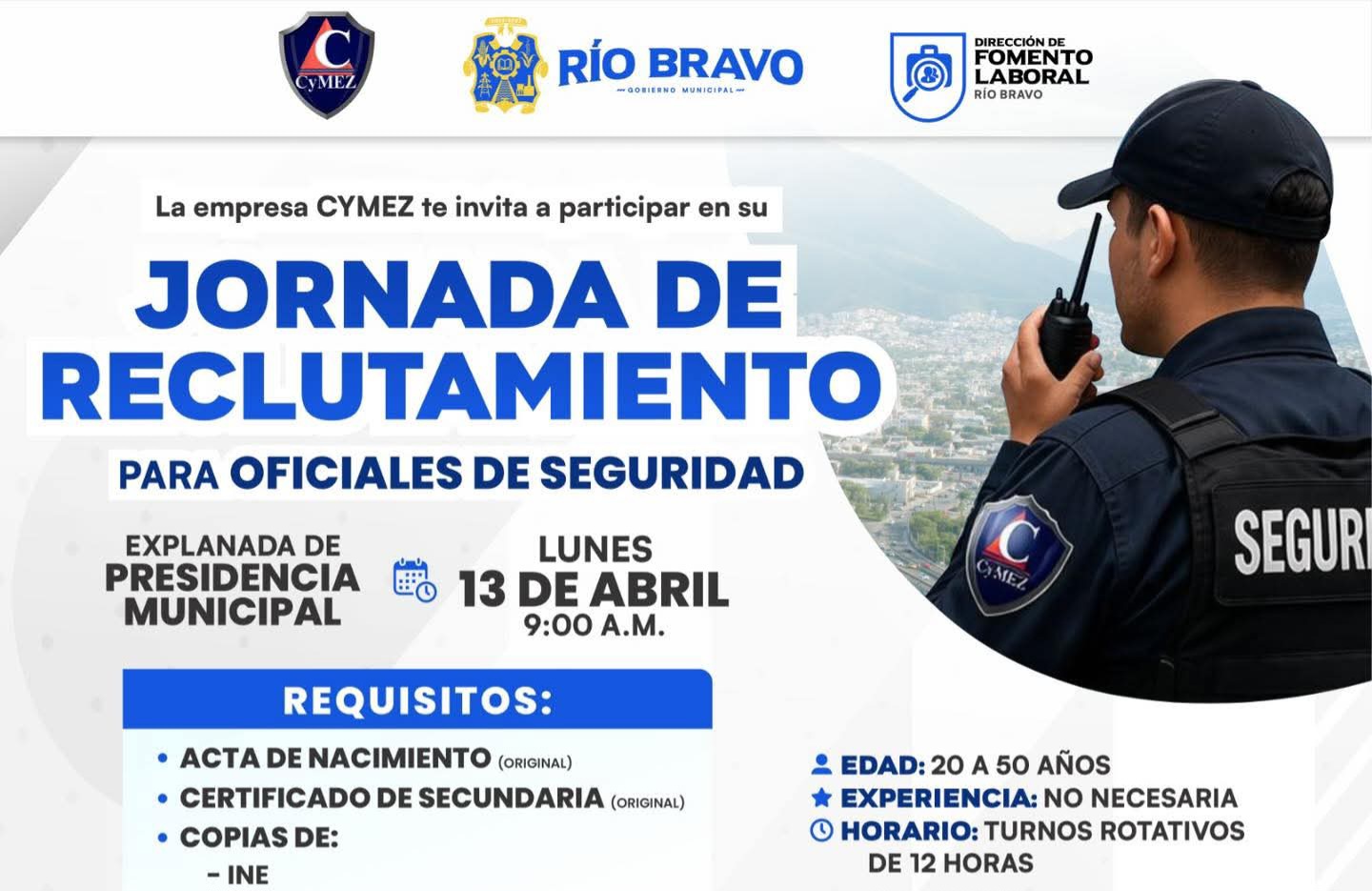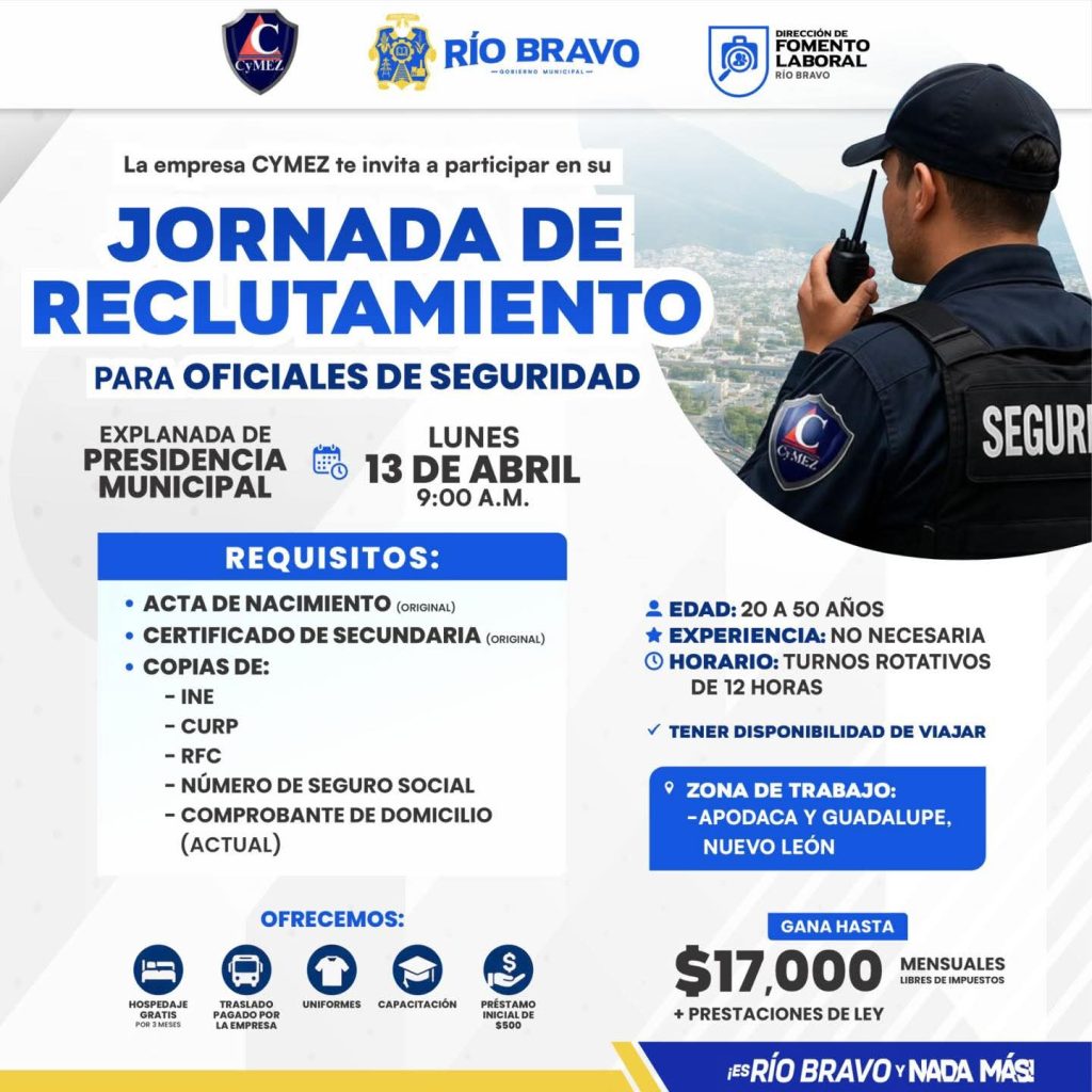 RIO BRAVO.- Este lunes 13 de abril, la empresa CYMEZ estará reclutando Oficiales de Seguridad en la explanada de la Presidencia Municipal.