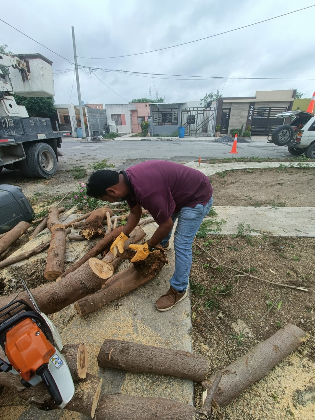 Las acciones continuaron en la colonia Hidalgo, donde se taló una palma caída en la calle Camargo y se cortó a la mitad otra palmera para prevenir un futuro accidente. Ya por la tarde, en el Fraccionamiento Reynosa, se acudió a reinstalar una lámpara que también resultó derribada.